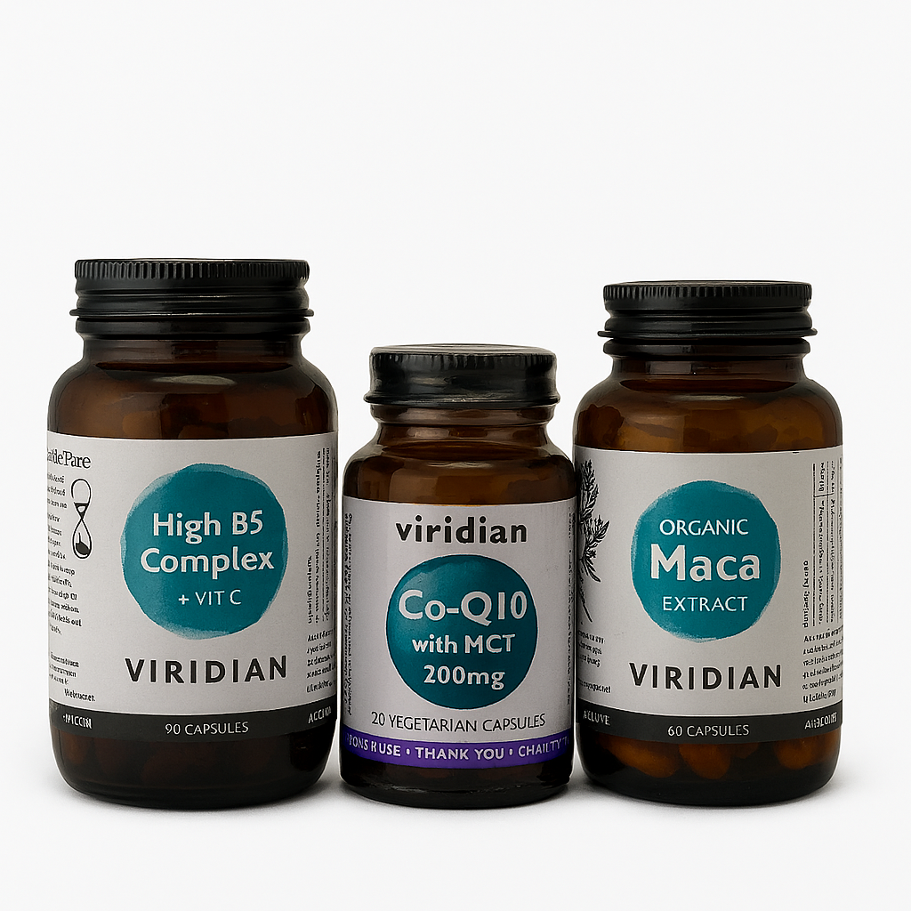Natural energy supports without caffeine crashes. CoQ10 fuels cells, maca boosts stamina, B5 maintans energy metabolism.